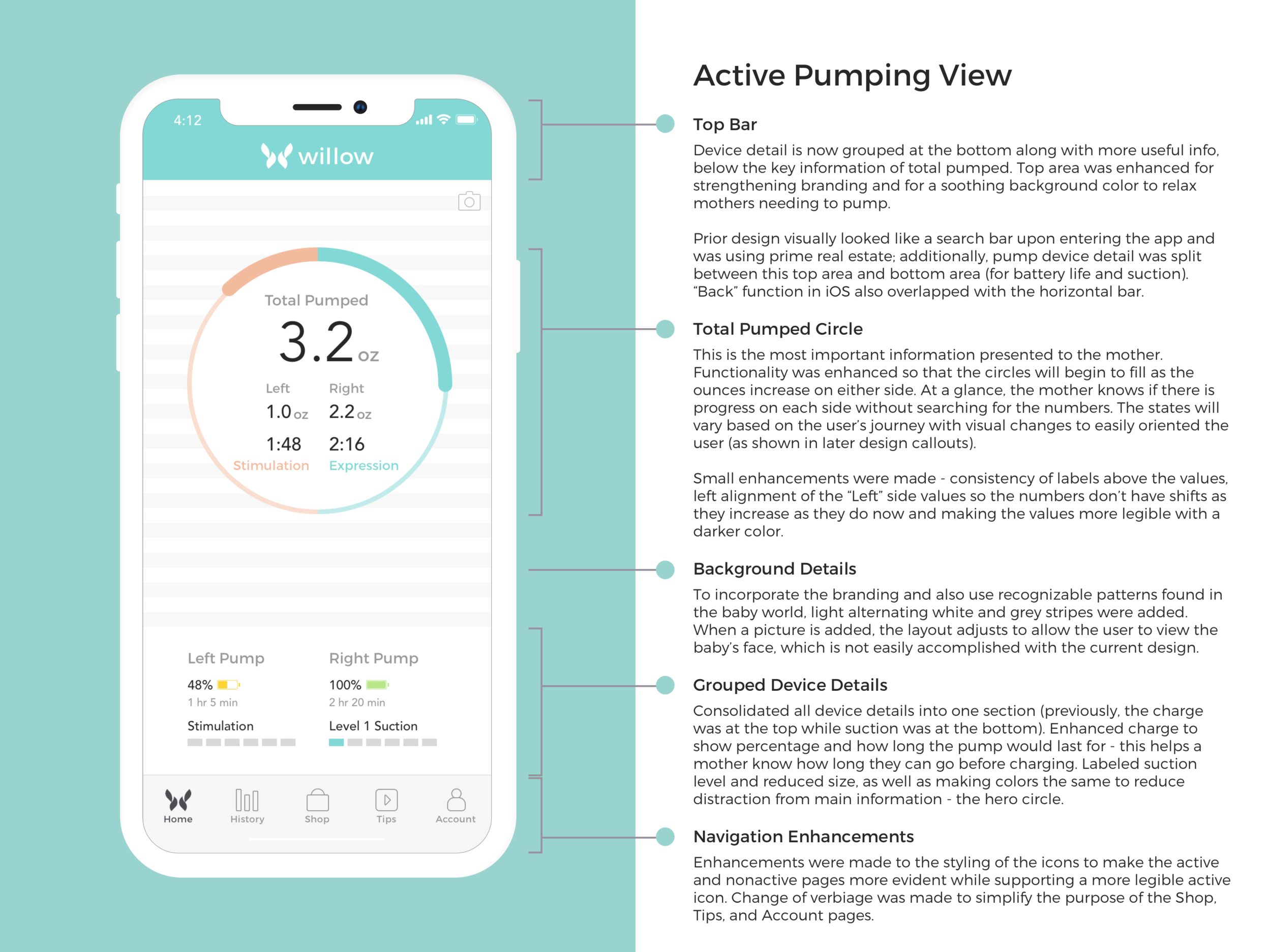 As a user of the Willow Pump and a UX Designer by profession, I found myself with a natural inclination to identify areas for improvement based on daily usage of the device in conjunction with the app. The design work below shows the redesign based on these inclinations.